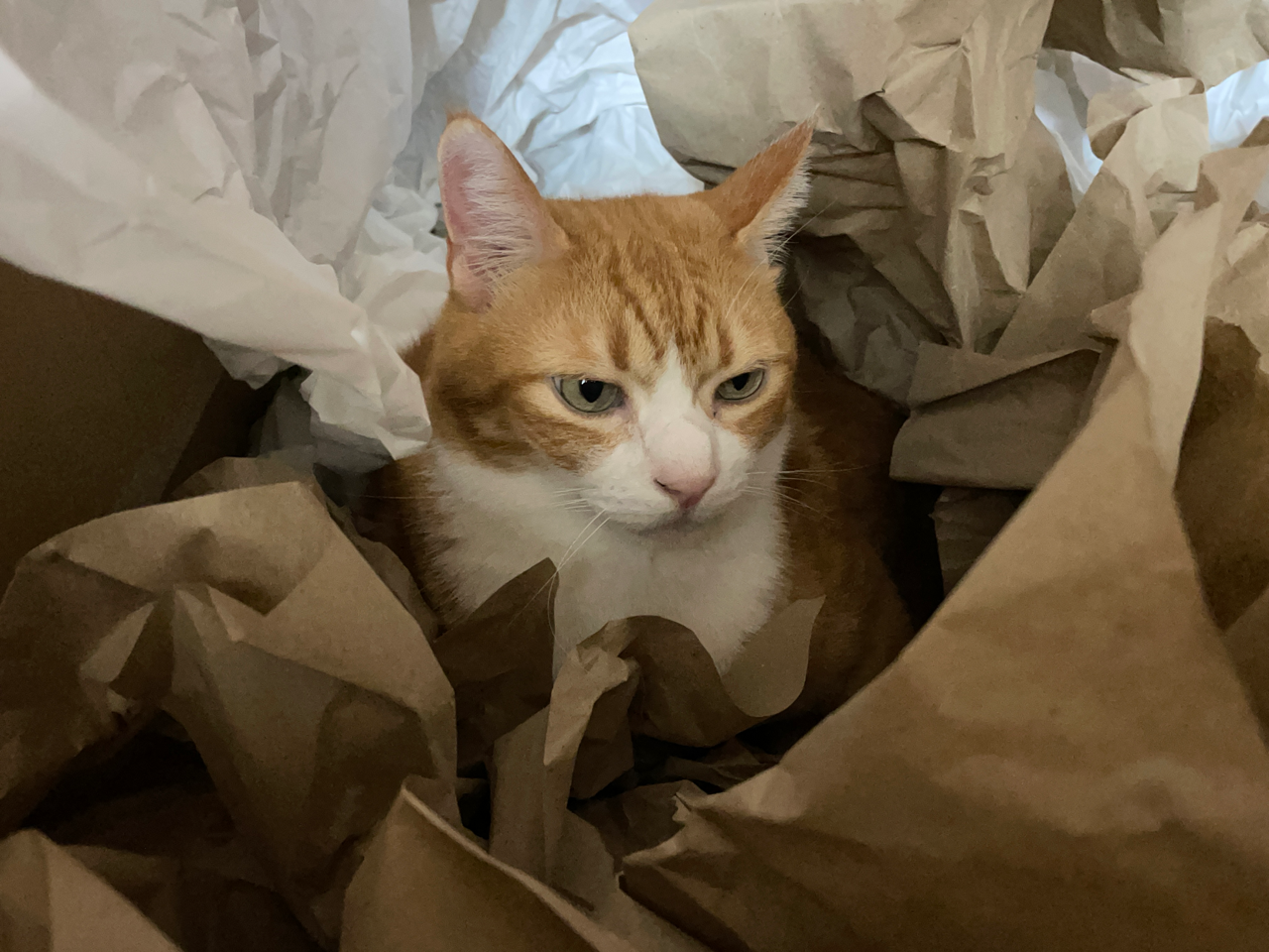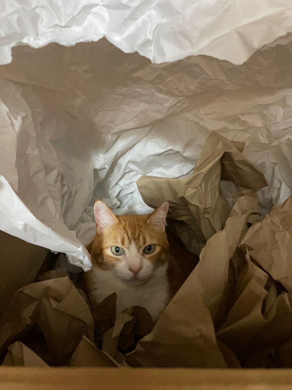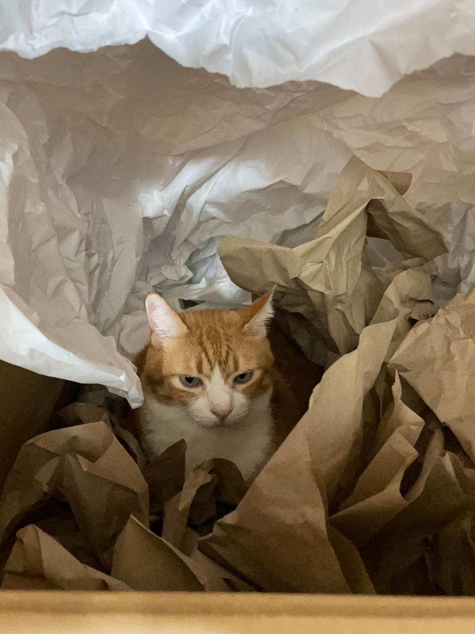 大きいダンボールに、緩衝材の紙をふわふわに敷き詰めて、テントみたいに屋根を作ってあげると、猫が収まります🐈定期的に緩衝材の紙を足してあげると喜びます。