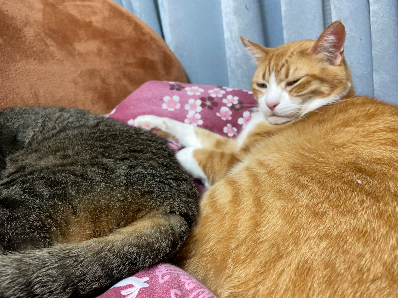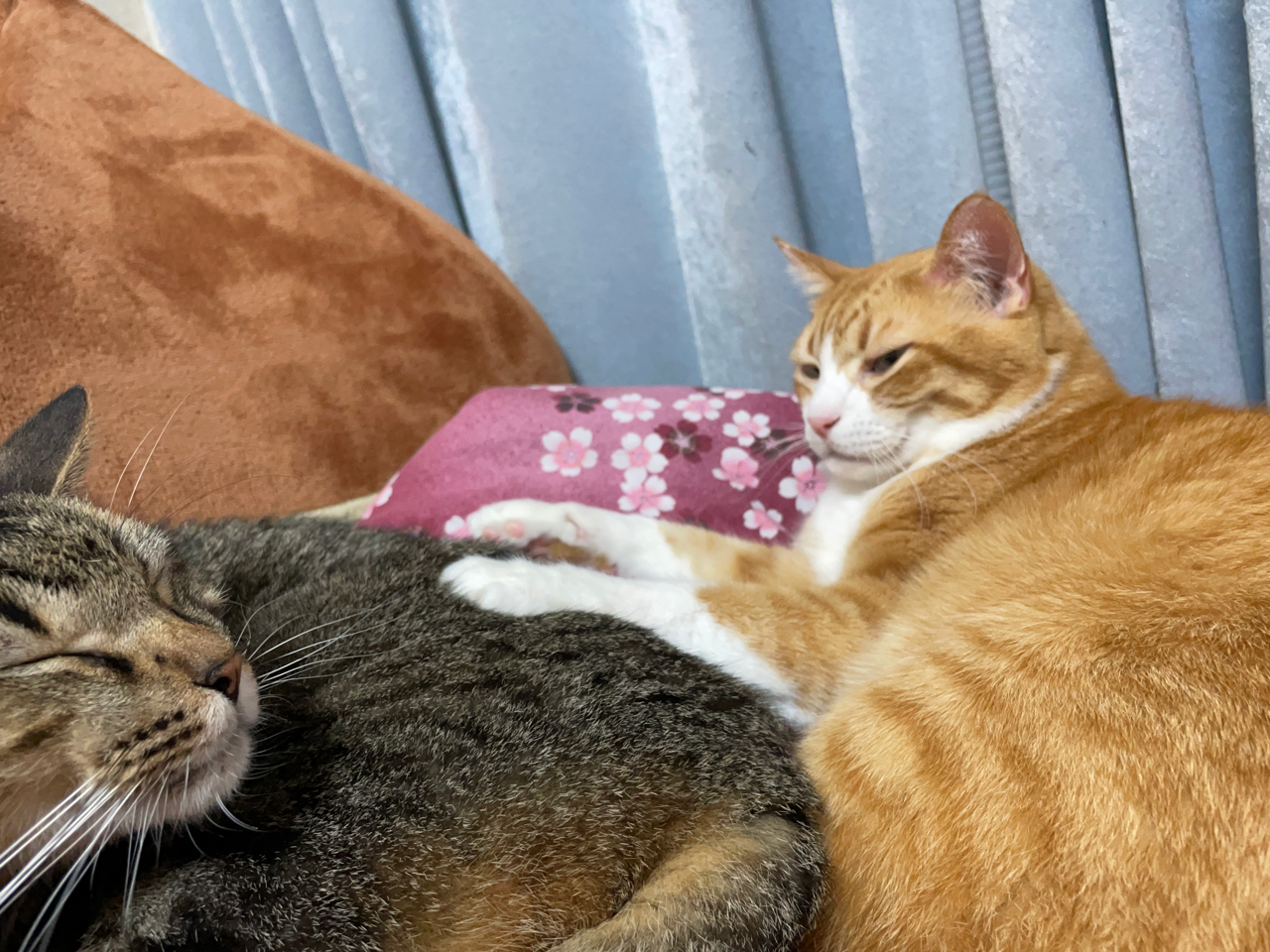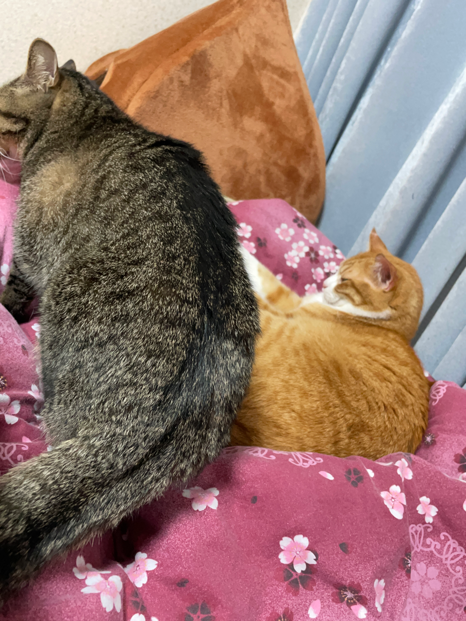 他の猫とくっ付きたいのに、くっ付き方がちょっとウザいため怒られてしまう末っ子(元)🙀お兄ちゃんが眠たいタイミングでどうにかくっ付くことに成功。よかったね。